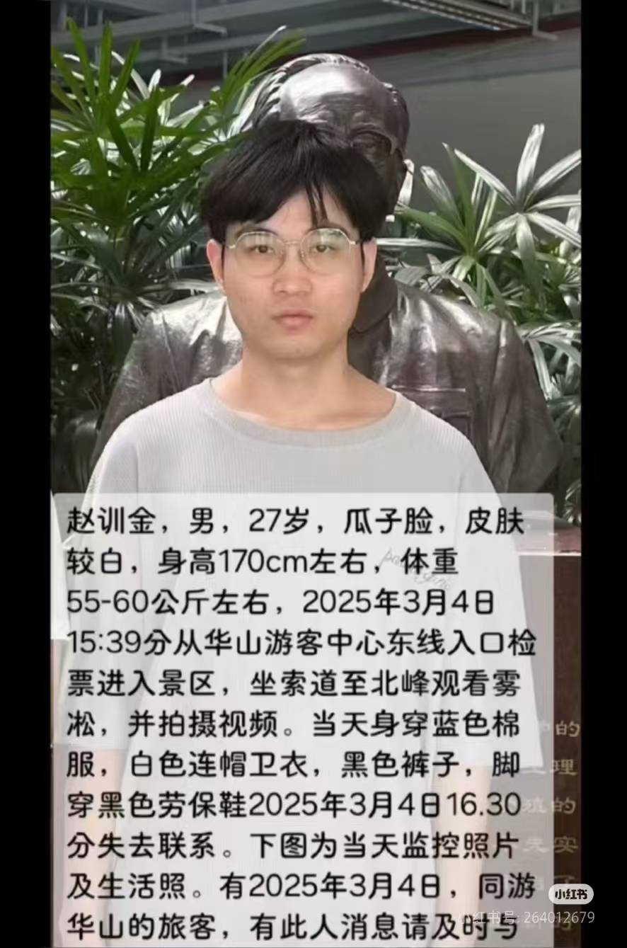 据家人发布的寻人启事描述:赵训金脸型为瓜子脸,皮肤较白,身高约170cm,体重在55-60公斤左右。他于2025年3月4日15:39从华山游客中心东线入口检票进入景区,并乘坐索道到达北峰观赏雾凇并拍摄视频。当天身穿蓝色棉服、白色连帽卫衣、黑色裤子及黑色劳保鞋,最后于16:30失联。若有同日在华山遇到他的旅客,请尽快与其家人联系。